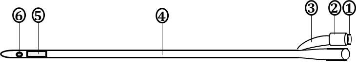 Thành phần của Ống thông tiểu hai nhánh: 1. Van caosu 1 chiều – 2. Vòng caosu – 3. Phễu – 4. Thân ống – 5. Bong bóng – 6. Mắt